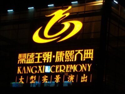 场地不是很大,比起少林寺和刘三姐来,可能取胜的在于内容,对于康熙皇帝一生总结的很好,最震撼的是那几十匹国外进口的战马,气势磅礴,情节连贯,让看过的人对于康熙爷的一生有了很好的认识,灯光效果的确很好,不过B区有点低,下次再去看一定得买A区或者vip了