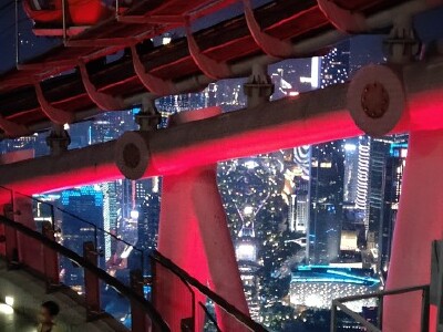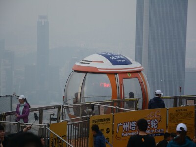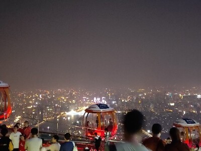 买的晚上六点到八点的观光票,十一当天晚上看到了广州城的国庆夜景,着实漂亮! 幸亏提前在途牛买的票,那天下午快五点到的广州塔,广播已经说当日的票全部售罄了,好险好险。 五点五十左右上到433米星空观光大厅,一圈都可以看,真是漂亮,还有个玻璃房可以拍照,就为了这个排了一个多小时,一直排到七点十分,刚好天暗下去,外面的灯亮起来。工作人员会指导我们摆几个简单动作,开闪光灯拿专业相机给我们来上几张,然后也帮我们用自己的手机拍了好几张,然后给了个号码,可以去前面看刚才拍的效果。你要是觉得好看,可以洗成相片,当然是要收费的,而且不便宜。然后乘电梯再次向上,登顶。一出来,大风呼呼的刮,那个摩天轮围着广州塔钢架的外围缓缓转动,看着都过瘾!话不多说,赶紧排队。