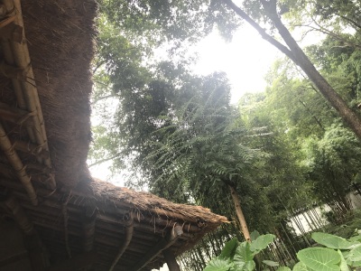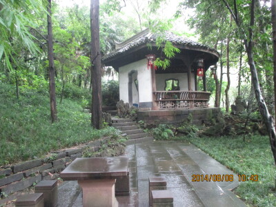 下着小雨,林幽景深。简陋的居室,已被修缮,不知杜老师当年如何渡过大雨天。