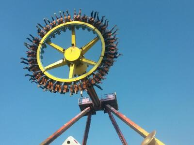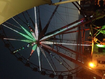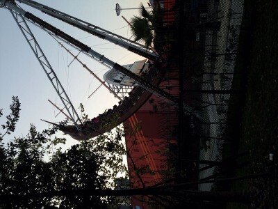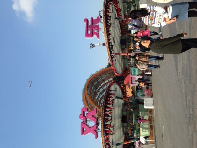 大部分游戏都带有一定的挑战性,虽然保护措施可以一百个放心,但坐上去之后的感受真的完全不一样! 大摆锤是最刺激的,是真正勇敢者的游戏.样子是普通的单摆,来回左右摆动,两边的摆动都超过了90度.摆锤下面悬挂的就是一个大圆盘,大概有40多个座位围着圆盘坐成一圈.摆锤坐单摆的左右摆动,圆盘则绕着摆轴一会儿顺时针,一会逆时针地快速转动. 我坐的时候根本不敢睁开眼睛,觉得头脑发昏,头晕目眩.一会儿超重,一会儿失重,一会儿上去到了最高点,感觉要飞出去了,一会儿落到最低点,只听得到风的声音.好不容易鼓足勇气睁开可眼睛,却只看到自己的双脚悬在空中,接着就是远处的高楼大厦都是倒着的.坐在旁边的人都在高声尖叫,哭爹喊娘的还算是能控制自己的,完全不能自已的就只能一阵撕心裂肺地狂呼. 玩完了以后,很多人突然不会走路了,因为还沉浸在摇摆的惯性之中.至少要等上5分钟才能恢复过来.
